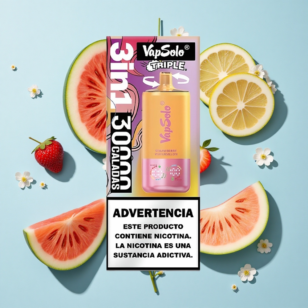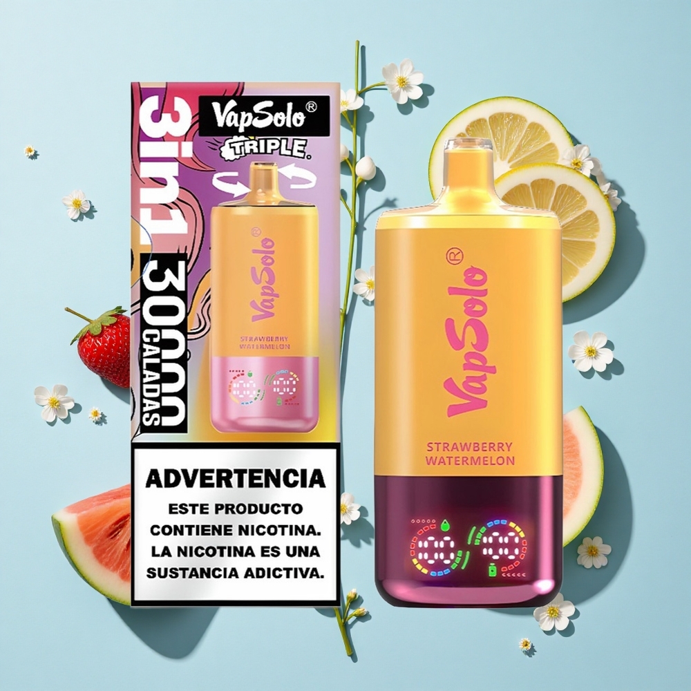 VapSolo Triple 30000 Puffs Vape Descartável Morango Melancia & Pêssego Limão 40ml 50mg Type-C